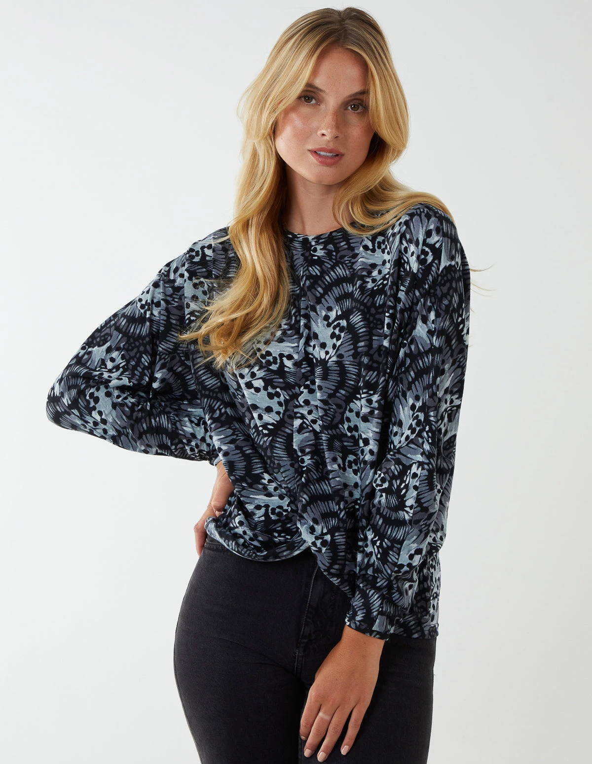 Comfy and chic. That’s our Butterfly Print Knot At Hip Cut & Sew Top. Go on casual drinks with your friends by matching this batwing long sleeve top with high waisted blue jeans and heeled boots.