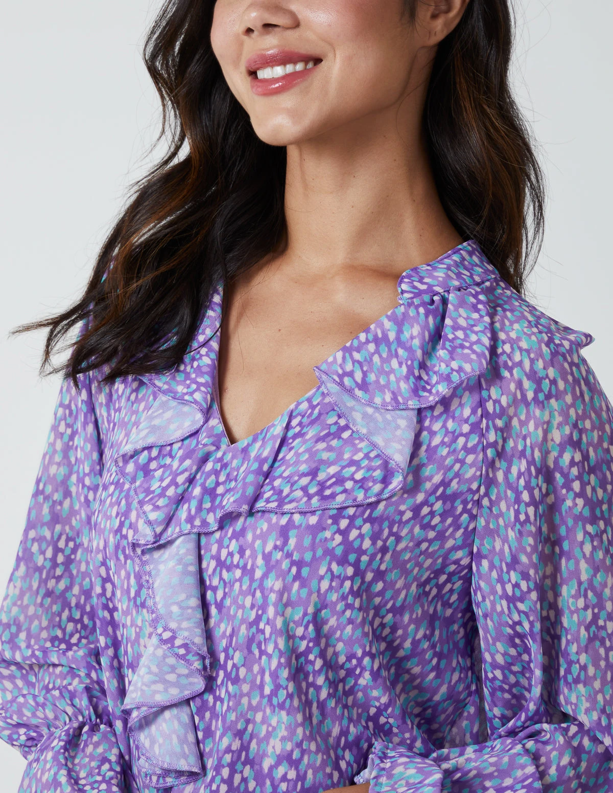 This relaxed-fitting chiffon frill blouse has a ruffle detail running the length of the front of the blouse and a long sleeve finished with a smock detail cuff. A wearable work-to-weekend piece.
