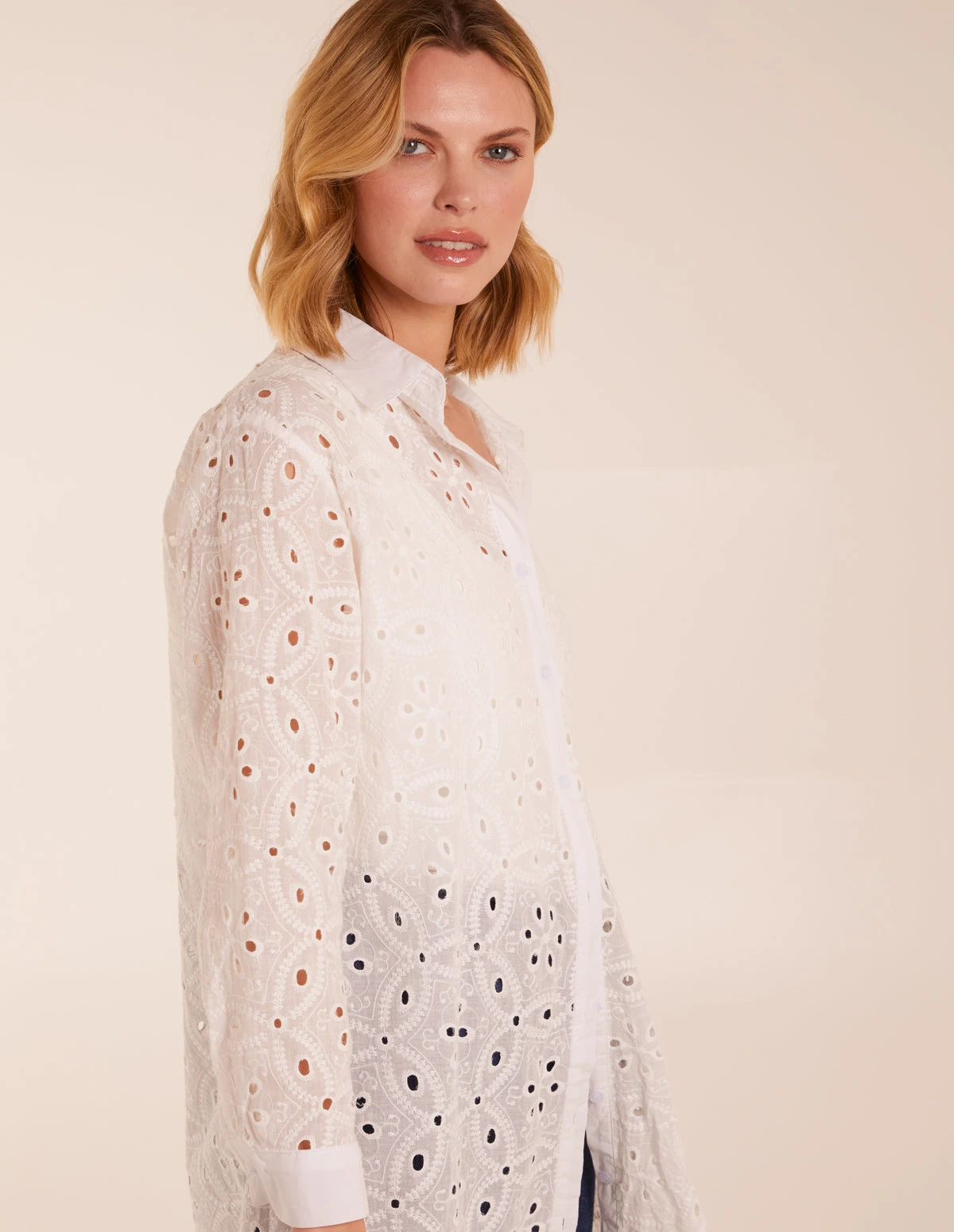 A light breezy option! This timeless broderie shirt will update your jeans in time for spring.
