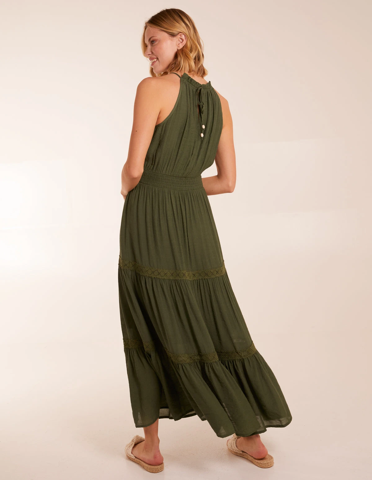 For women who love floaty styles, choose this shoulder-baring silhouette halter neck dress is this dress for you. Style it with beach wavy hair and oversized sunnies.