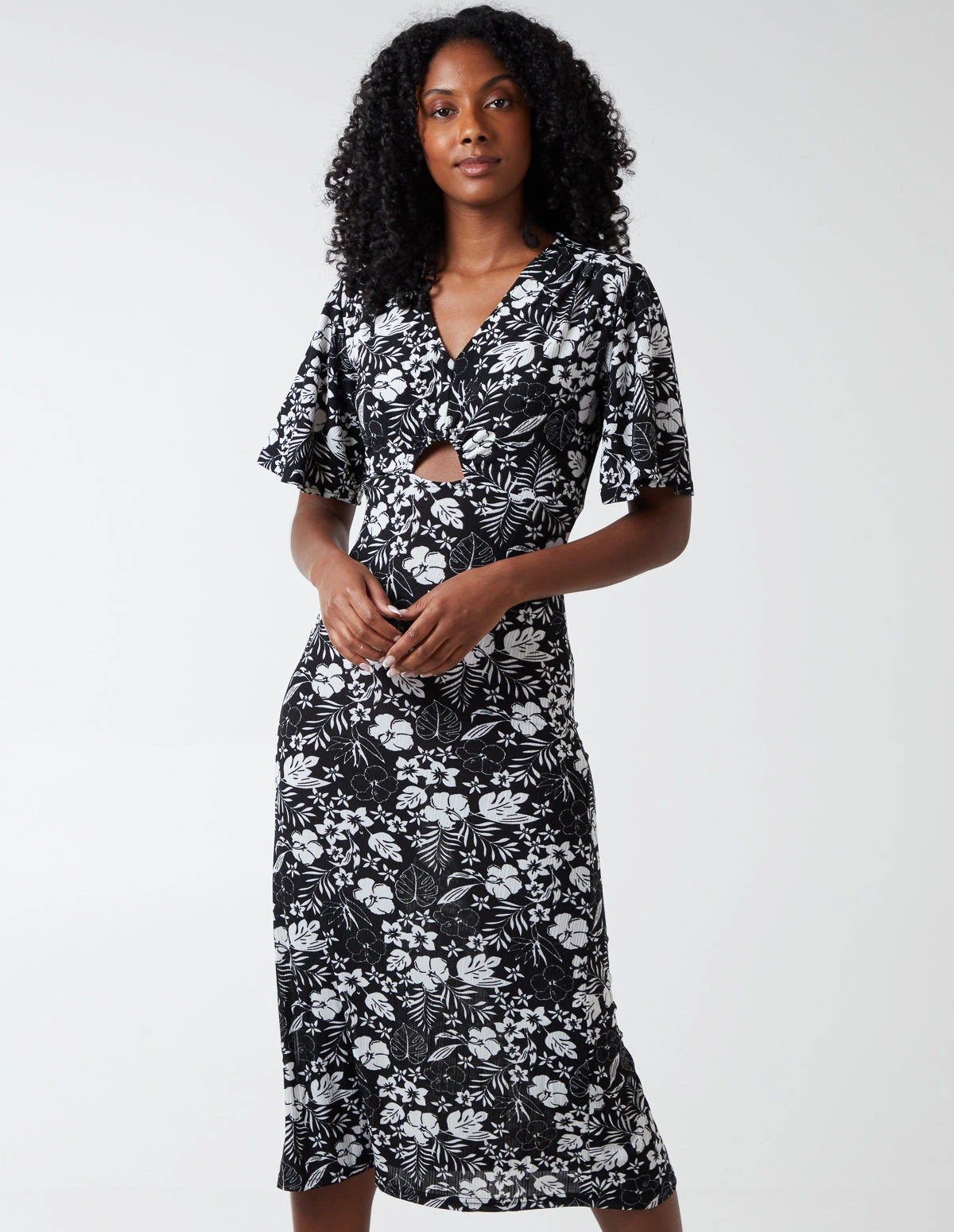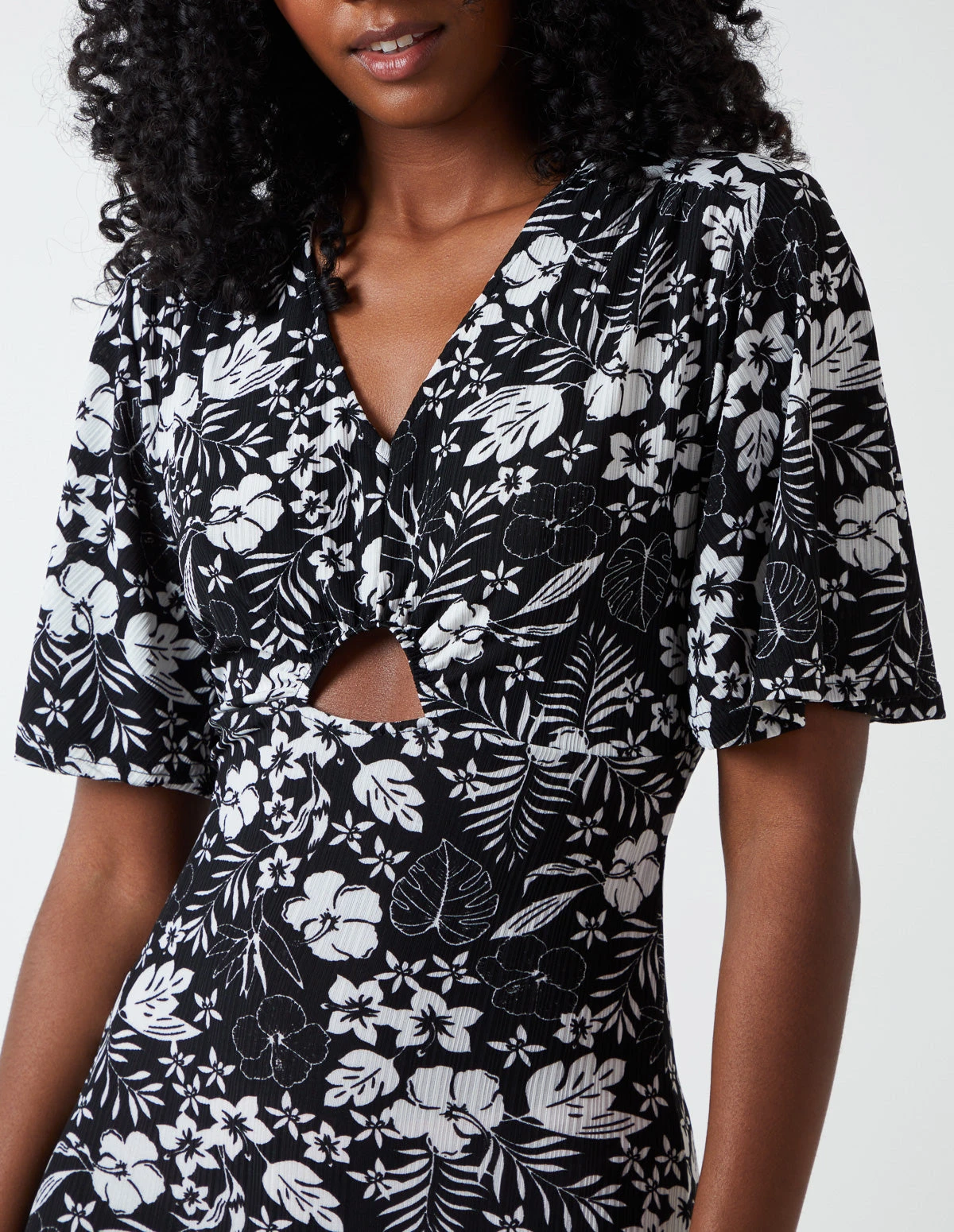 This lightweight midi dress will be an essential for your summer wardrobe. With floral print and bust cut out this dress will keep you cool when things start to heat up. Pair with pair of sandals for a chic summer look.Â