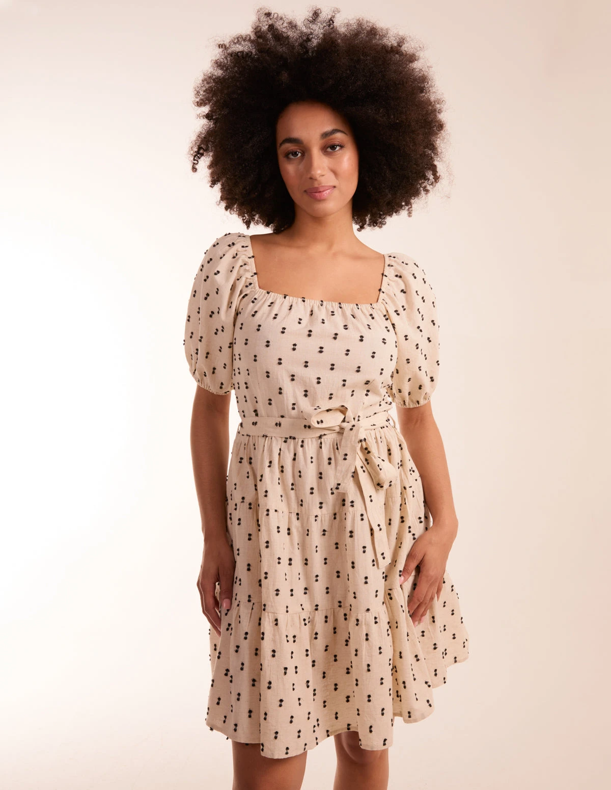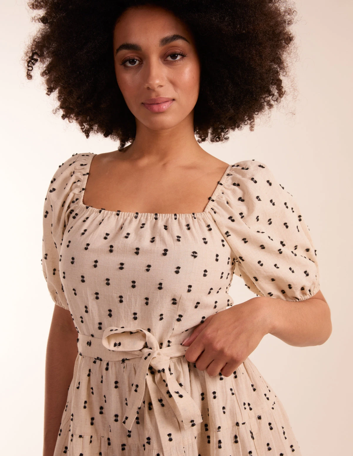 Look pretty in polka dots and pick this linen bardot dress, cut to a flattering mini length. Boasting a belted waist, it looks fab with knee-high boots and a leather tote.