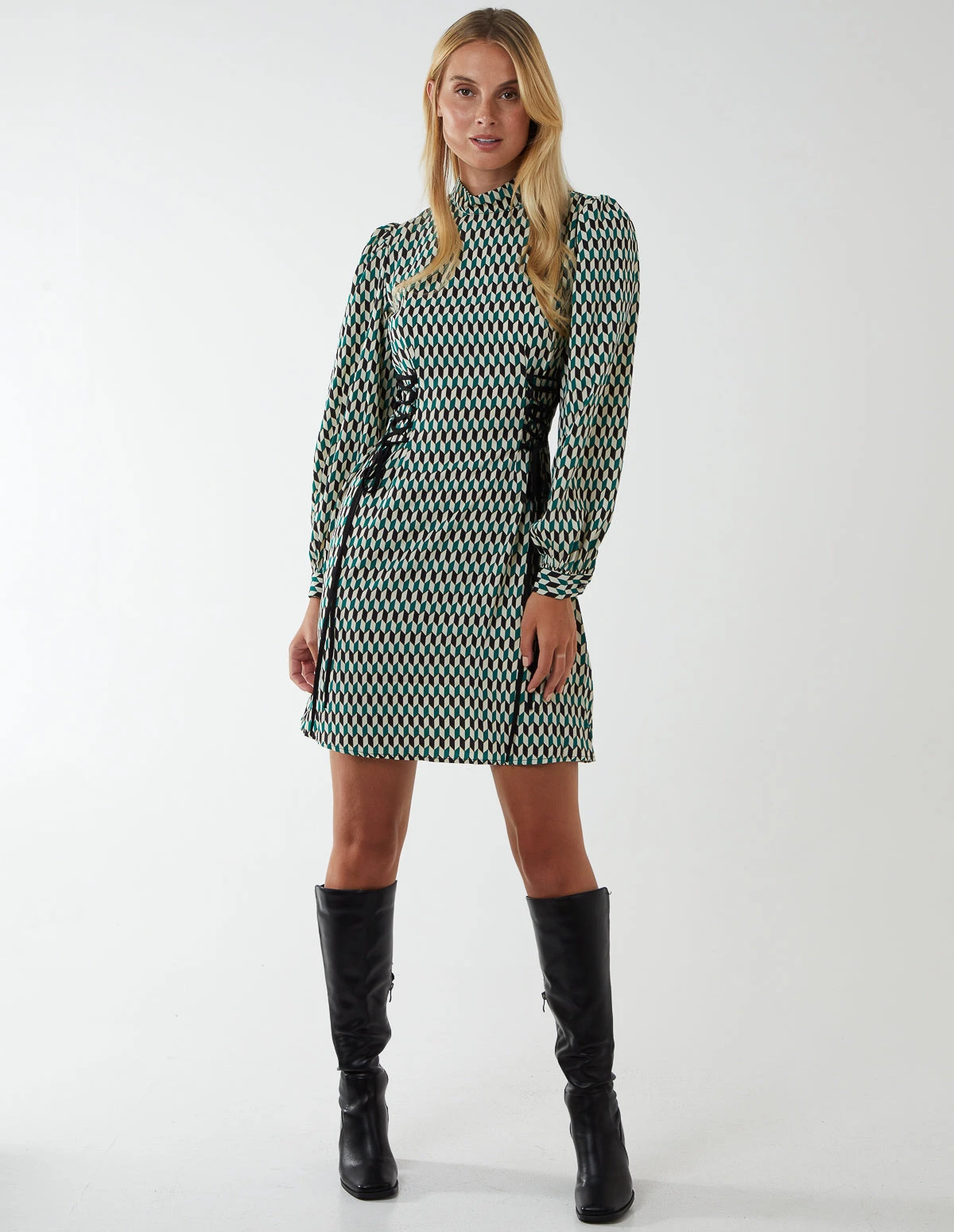 Meet the Geo Print Lace Side Waist High Neck Dress. A dress ideal for the workplace, with elements such as a high neckline, an elasticated side waist and 3/4 length sleeves. Wear with black boots to complete your look.