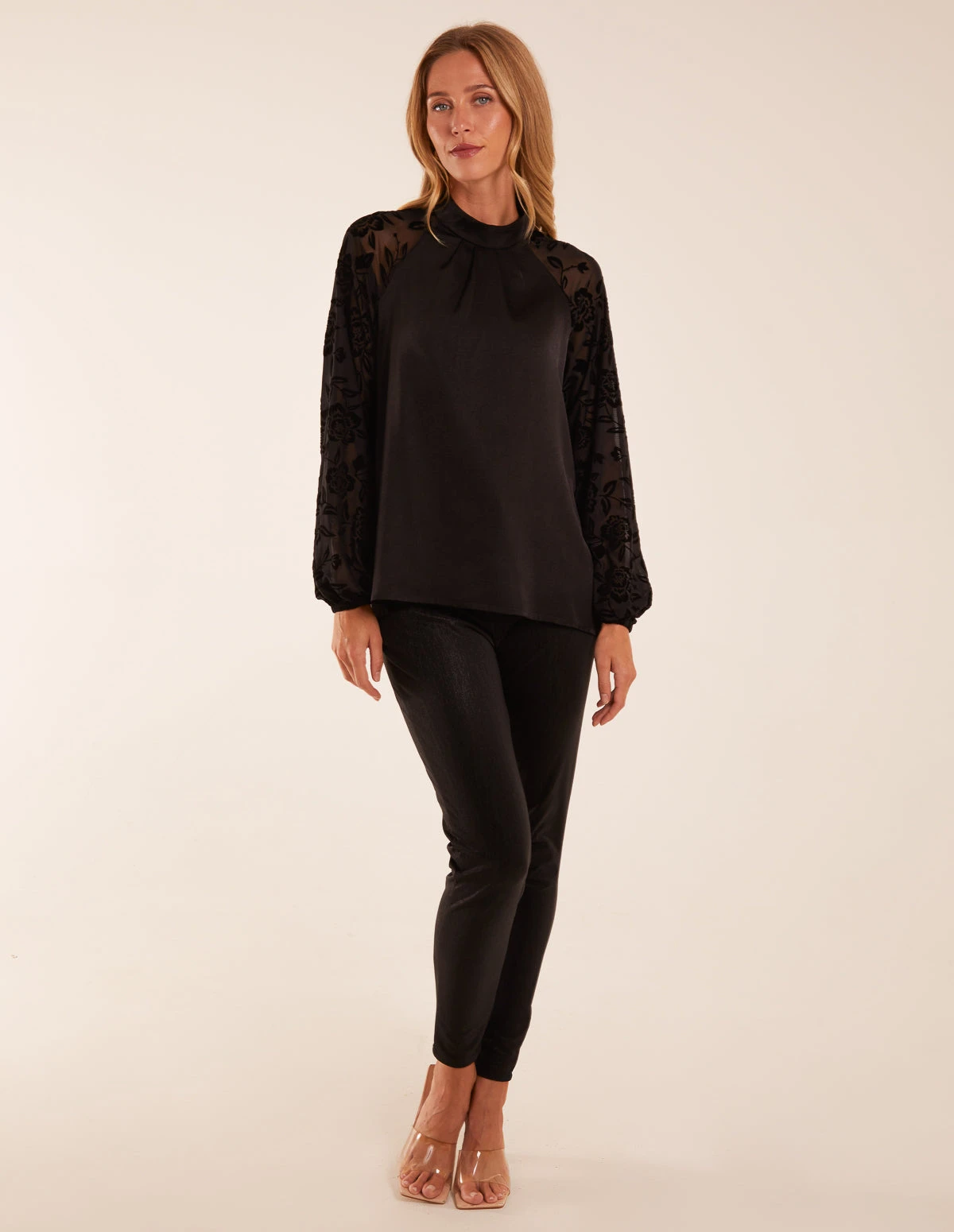 A perfect pick for a day-to-night outfit with Blue Vanilla’s High Neck Flocked Sleeve Top. We got you covered!
