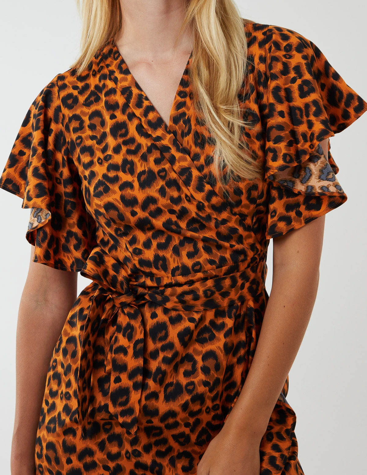 Make a statement this season with this leopard print dress! With a wrap front, tie waist and frill sleeves that add a refined element to the dress, complete your look by matching with wedge shoes.Â