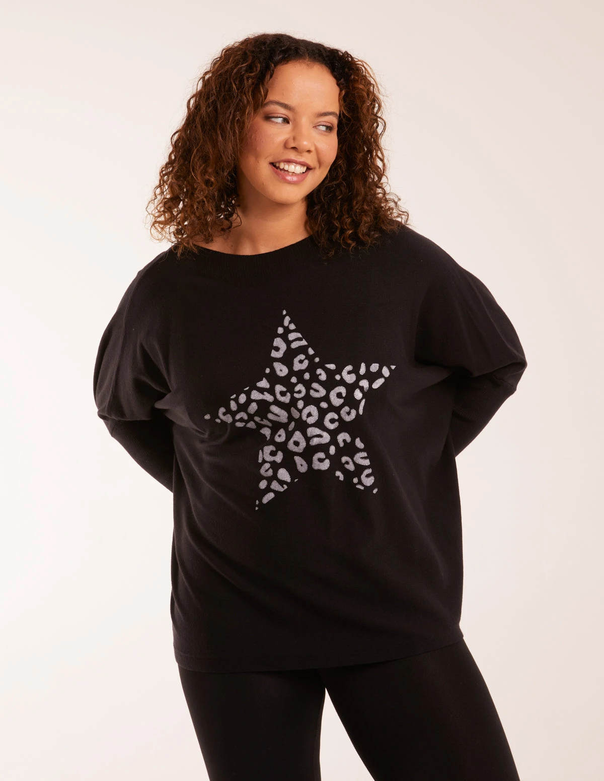 This batwing star jumper is all about comfort and style. Made from a super soft knit fabric and features an embellished leopard-printed star design and buttons at the back. Wear this jumper with skinny blue jeans and sneakers for day-to-day!