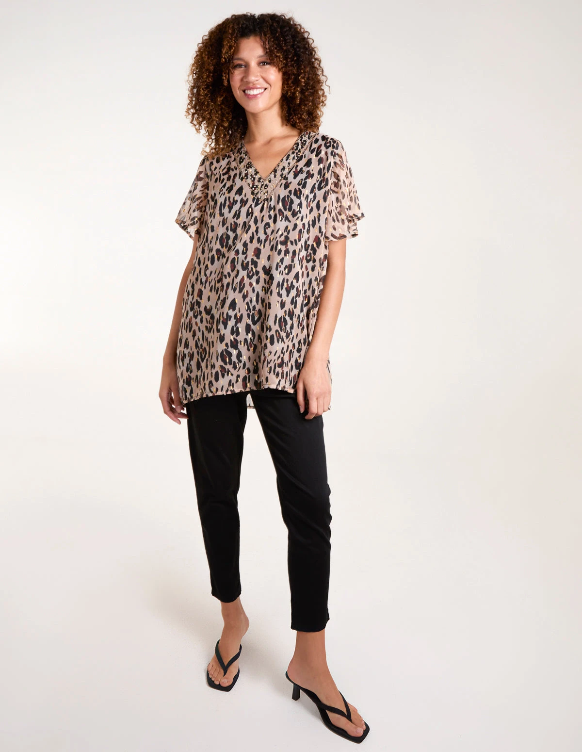 A dreamy kind of blouse! Its floaty lightweight fabric gives an elegant feel, along with its bold print, and embellished tailing. Team with formal wide-leg trousers and let the tunic do the talking!