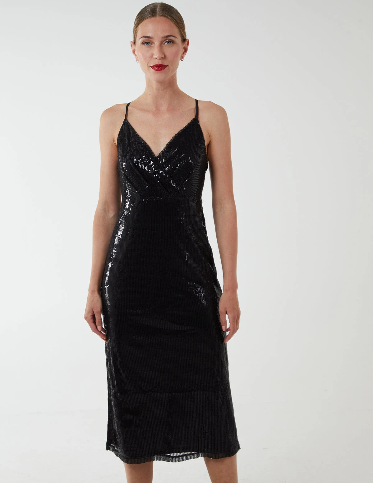 Whatever special day you have coming up, the Wrap Front Cami Midi Dress will not disappoint you. This sleeveless sequin dress with a v neckline, is guaranteed to make everyone’s eyes turn your way as you walk in to the party with those cut out high heels and a mini bag.